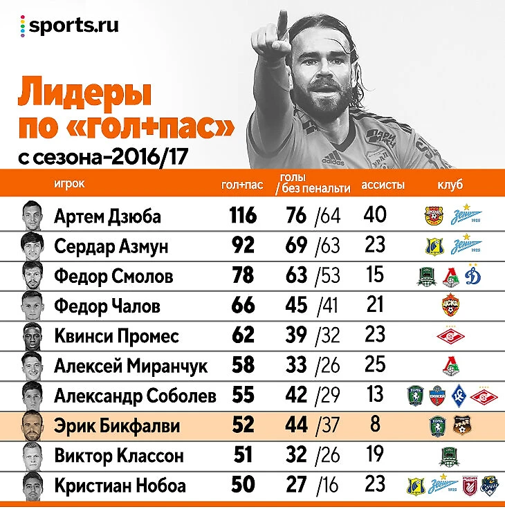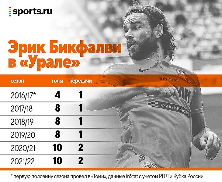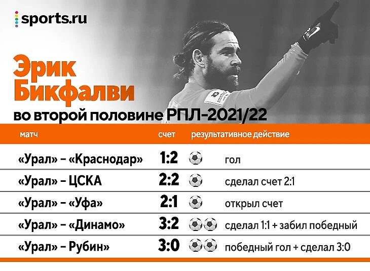 Эрик Бикфалви – главный герой весеннего спасения «Урала» от вылета. Начиная с марта он забил 7 мячей (в том числе «Краснодару», ЦСКА и «Динамо») и закрепился в статусе одного из лучших игроков в истории клуба. Эрик – главный бомбардир «Урала» в чемпионатах России (41, опередил Юрия Матвеева с 33 голами) и второй по сыгранным матчам в РПЛ (137, Денис Кулаков – 185).