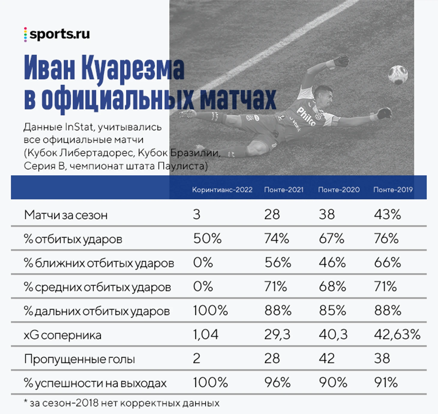 Иван Куарезма перешел в «Коринтианс» зимой 2022-го. До этого он играл только в Серии B (в 2016-м вышел на пару минут в вышке чемпионата Бразилии – больше шансов на таком уровне не было), а в новом клубе сидел под Кассио Рамосом (выходил только в Кубке Либертадорес на последний тур и в Кубке, когда команда вела 2:0).