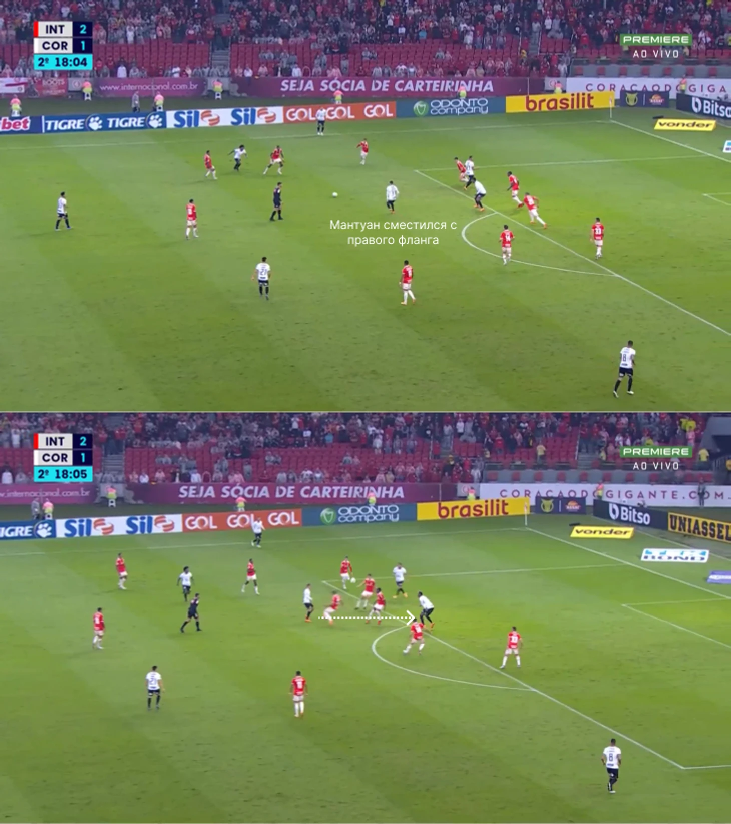 Широкая позиция помогала в роли латераля: Мантуан неплохо подключался и навешивал в штрафную справа – так создал 3 момента. На этой позиции его манера игры в атаке напомнила стиль Данила Кругового – Мантуан тоже создавал шансы благодаря дриблингу через середину, периодически заканчивал эпизоды из центра штрафной.