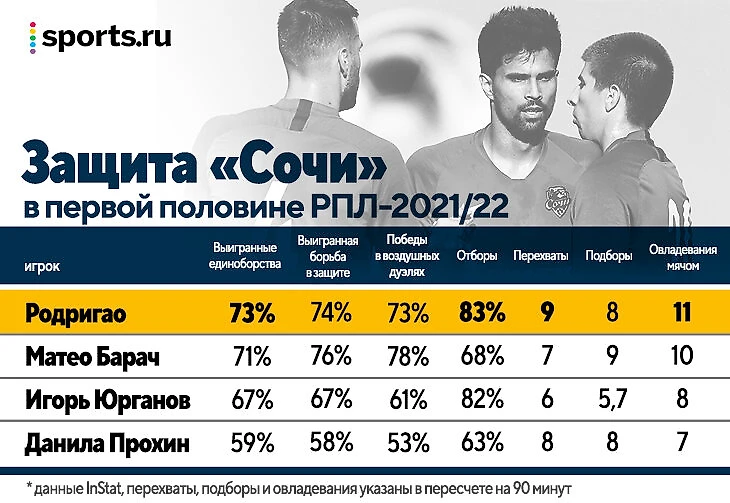 Именно Родригао маскировал проблемы «Сочи». Прохин хорош на мяче, но не очень здорово борется (всего 58% выигранных единоборств, 53% – вверху). Барач и Юрганов делили место в старте, а весь «Сочи» шел девятым по качеству допущенных моментов без учета пенальти.