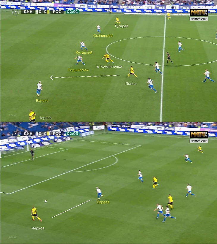 Дальше «Ростов» сыграл широко: Чернов высоко открылся и дистанцировался от крайнего защитника «Динамо». Еще был важен Комличенко – его рывок выманил Паршивлюка и вынудил Варелу сделать еще несколько шагов в середину, что совсем освободило Чернова от потенциальной опеки. В итоге Моро спас команду в последний момент.