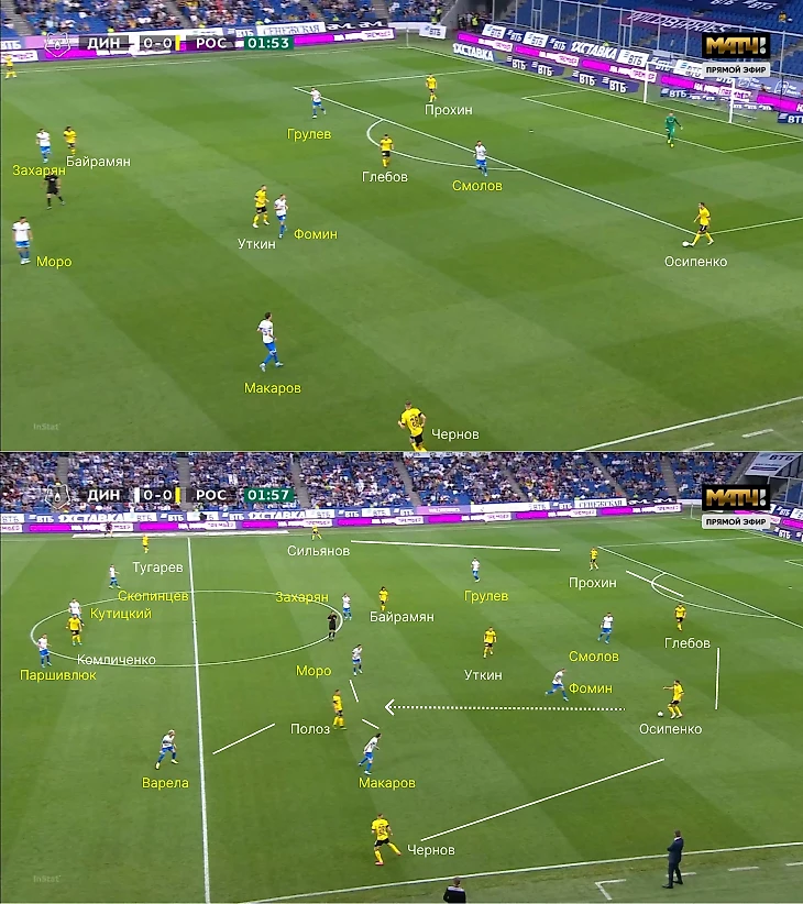 «Ростов» классно выбежал уже на второй минуте. Для этого он использовал несколько приемов. Во-первых, Песьяков начал атаку короткой передачей на Осипенко, который уже открывался в широкой позиции. Во-вторых, Полоз опустился в глубину – он оторвался от Варелы, просил пас между Моро и Макаровым, а затем отыграл опорную зону динамовцев через взаимодействие с Уткиным и Комличенко.