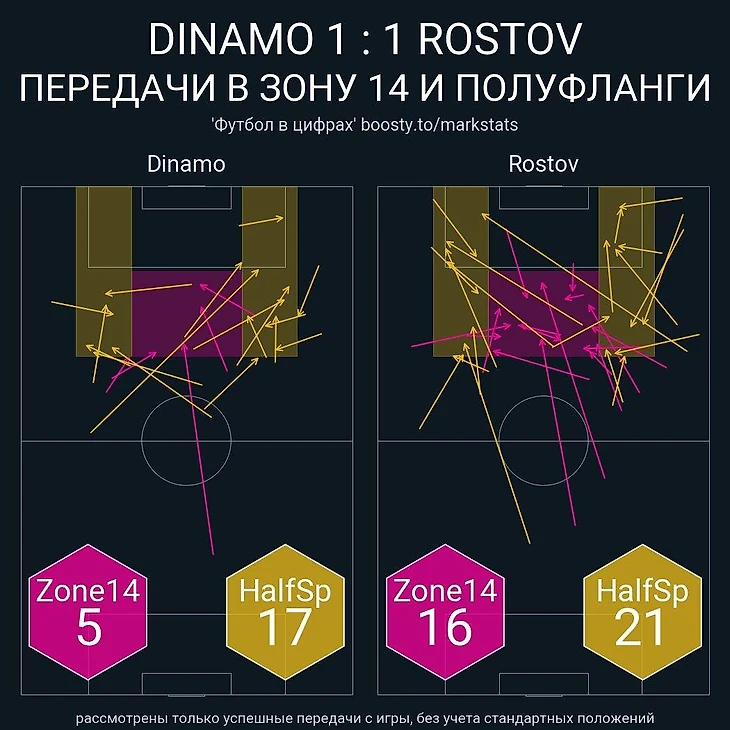 «Ростов» стремился к разным розыгрышам. Он выманивал «Динамо» в прессинг, растягивал их полузащиту, а затем переводил мяч на крайних защитников. Очень помогала активность и правильный менталитет Байрамяна и Уткина – они нацеливались на разрезающие фланговые передачи и не пожарили под давлением (даже когда в середине первого тайма прессинг «Динамо» стал более слаженным), а Осипенко и Прохин активно использовали переводы с одного фланга на другой.