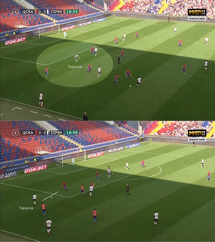 При обороне он играл левого центрального защитника, но во время владения роль становилась свободнее и гибриднее. Например, он помогал выходить из-под прессинга, когда становился крайним защитником (Макарчук поднимался выше) – так он разбивал зеркальность схем. Плюс Терехов важен при контроле мяча во время начала атак: неоднократно удерживал мяч под давлением, после чего партнеры переводили на другой фланг. В первые полчаса игра была равной, и часть подходов «Сочи» была спровоцирована смелой ролью Сергея. Терехов неоднократно заходил в середину, открывался на фланге (создавал ширину), включался в чужую штрафную.