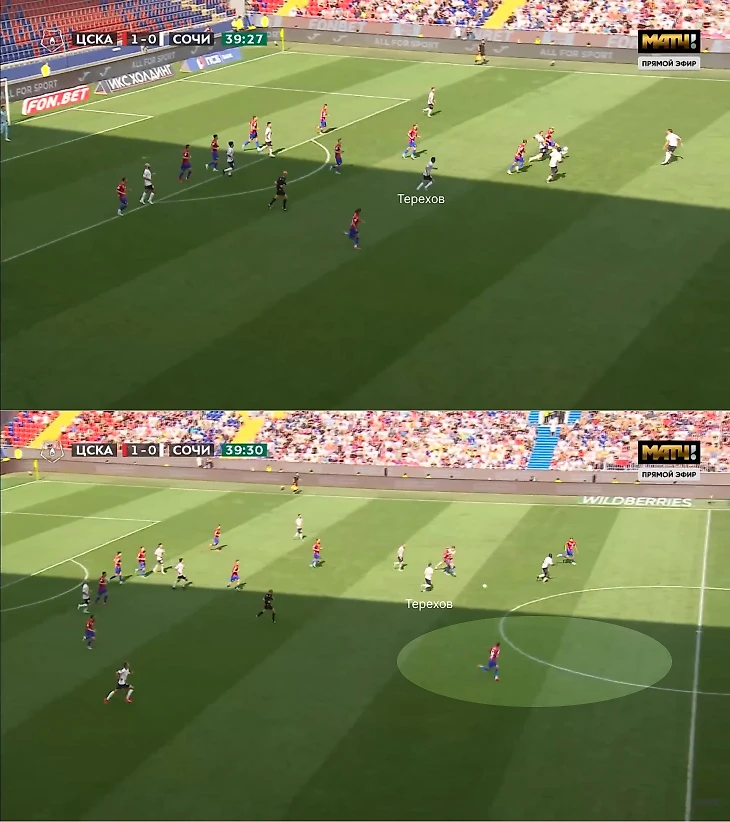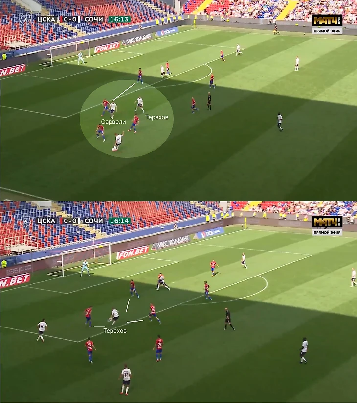 В этом эпизоде на 17-й минуте заметна двойная роль. Сначала Терехов открылся на линии штрафной. Он воспользовался движением Сарвели, которое увело Набабкина – так он получил мяч в свободной зоне и подал.
