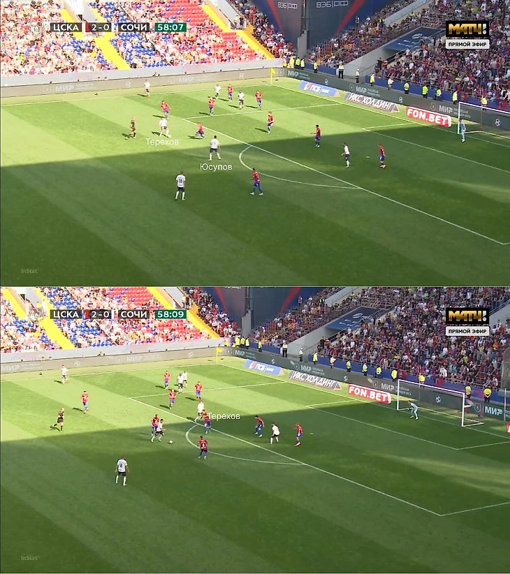 Но агрессивная атакующая роль периодически упрощала контратаки для ЦСКА, если «Сочи» не накрывал хозяев на приеме – это оголяло зону Терехова. Например, здесь Карраскаль выиграл борьбу, а Терехов застрял в середине – в итоге Медина и Чалов могли убежать 2-в-2.