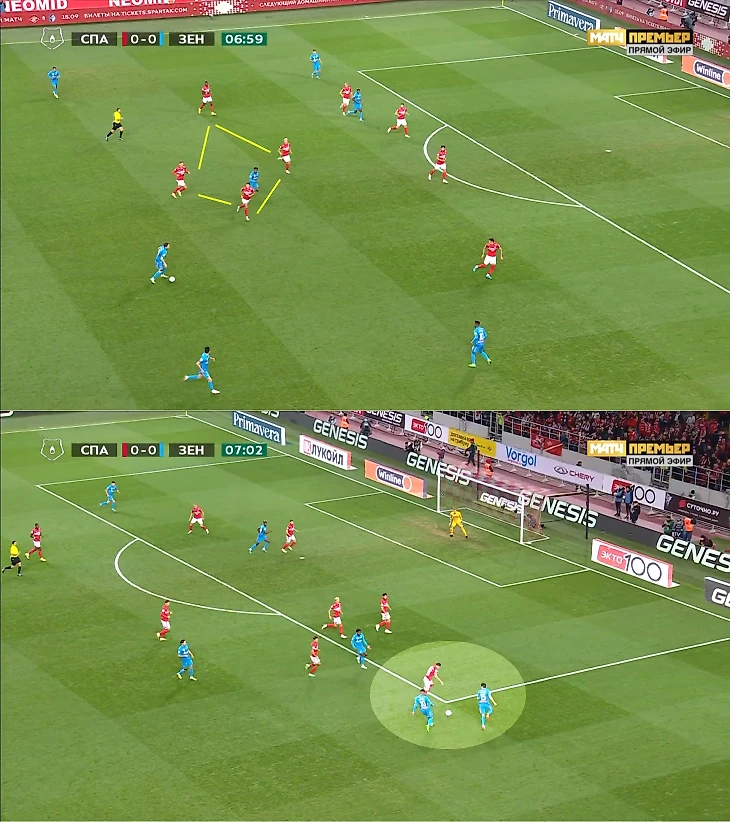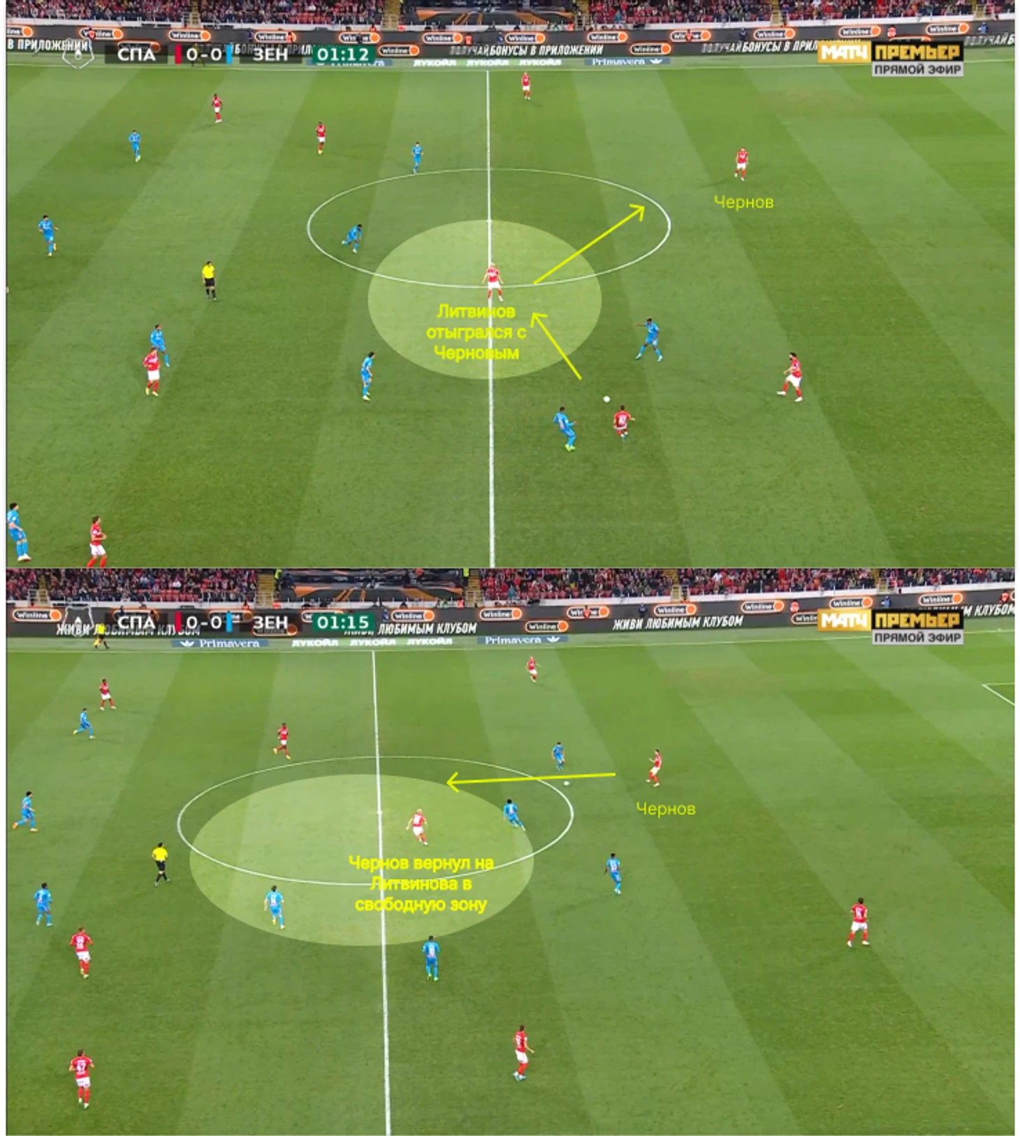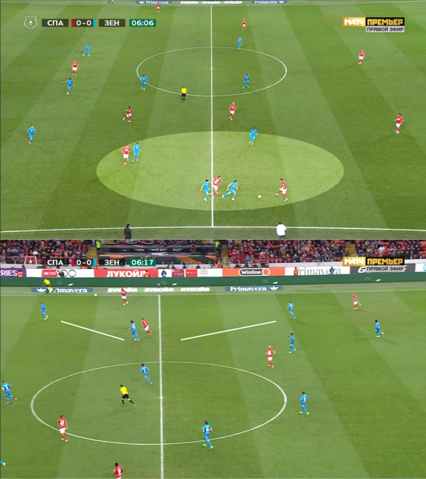 В первые 2 минуты «Зенит» не сразу разобрался с давлением на «Спартак», что позволяло Литвинову продвигать мяч. Первый полумомент «Спартака» с ударом Игнатова возник из-за несинхронизированного давления, в результате которого Руслан сначала принял мяч, а затем забежал в свободную середину и перевел на свободный фланг. В следующей атаке принцип сохранился – Литвинов снова был свободен, но «Спартак» закопался на фланге (о фланговых ловушках – ниже).
