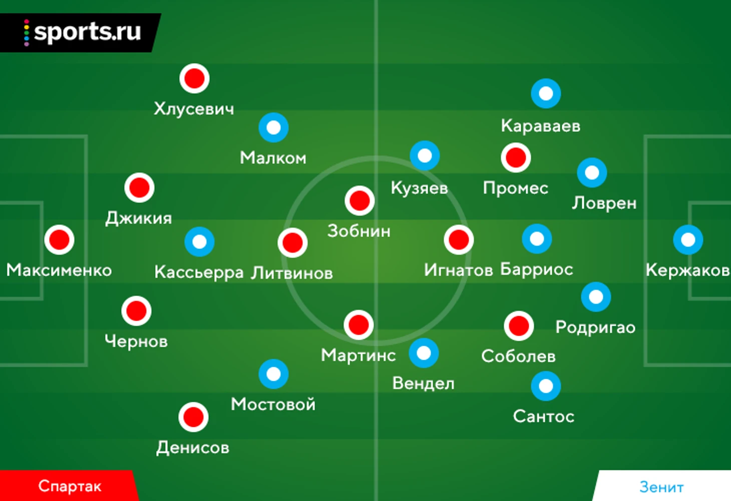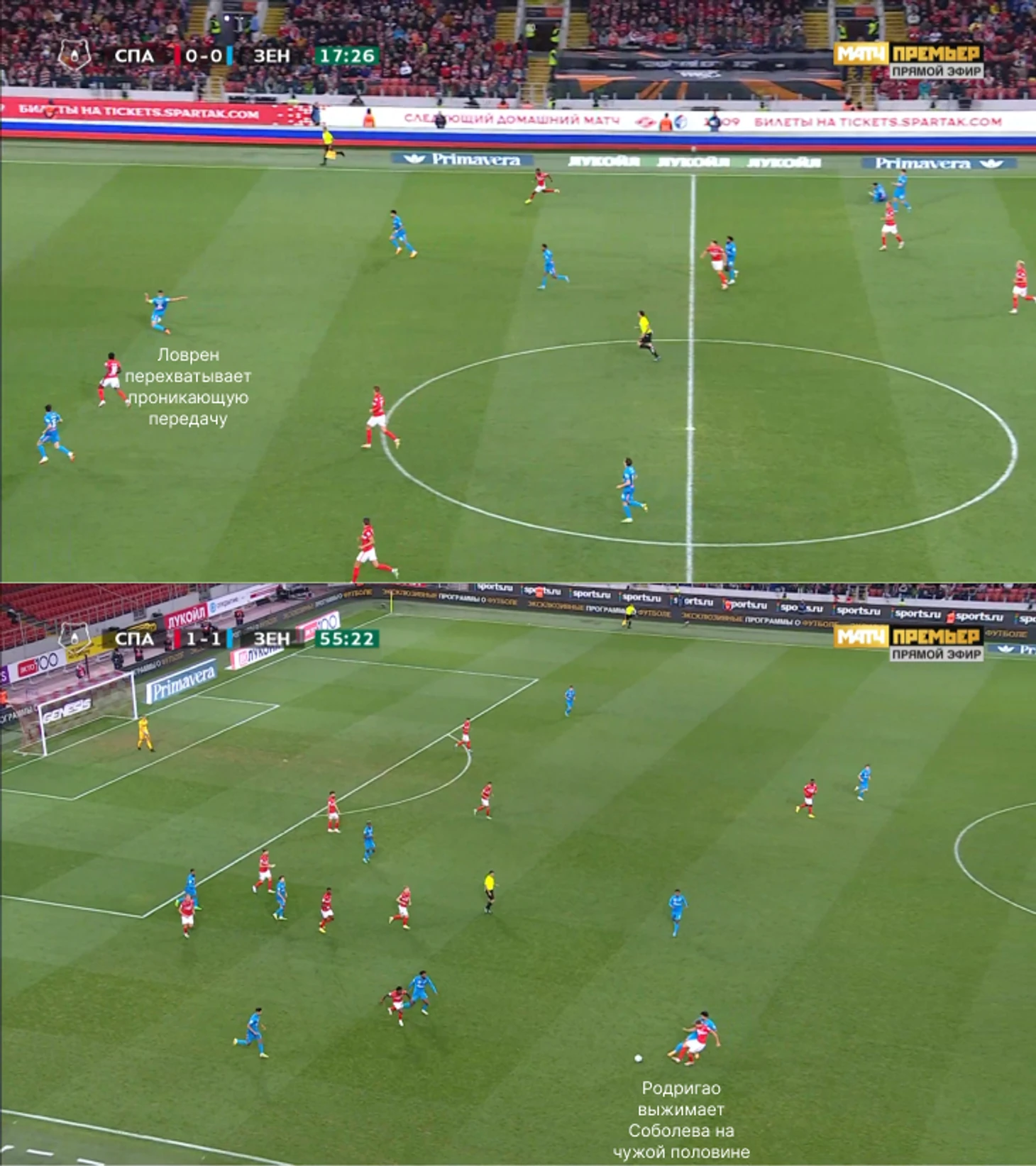 Дальше «Зенит» разобрался с прессингом Литвинова и «Спартак» уже с большим трудом развивал атаки. Хозяева все же создали несколько перспективных выходов (сначала Хлусевич неудачно отдал под забегание Зобнина, в другом – Соболев классно опустился и покатил вперед, но Ловрен прервал передачу в подкате), но до удара дошла только голевая атака – после матча Далер Кузяев рассказал, что полузащитники не дожали соперника. Видно, что Барриос и Вендел не разобрались с Игнатовым, Мартинс идеально вбежал, а Кузяев и Ловрен не успели к эпизоду – компактность была нарушена, и Соболев забил прекрасный гол.