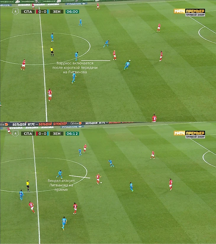 Барриос и Вендел тоже участвовали в давлении – в этом эпизоде оба полузащитника препятствовали коротким розыгрышам (Литвинов не рисковал с разворотами).