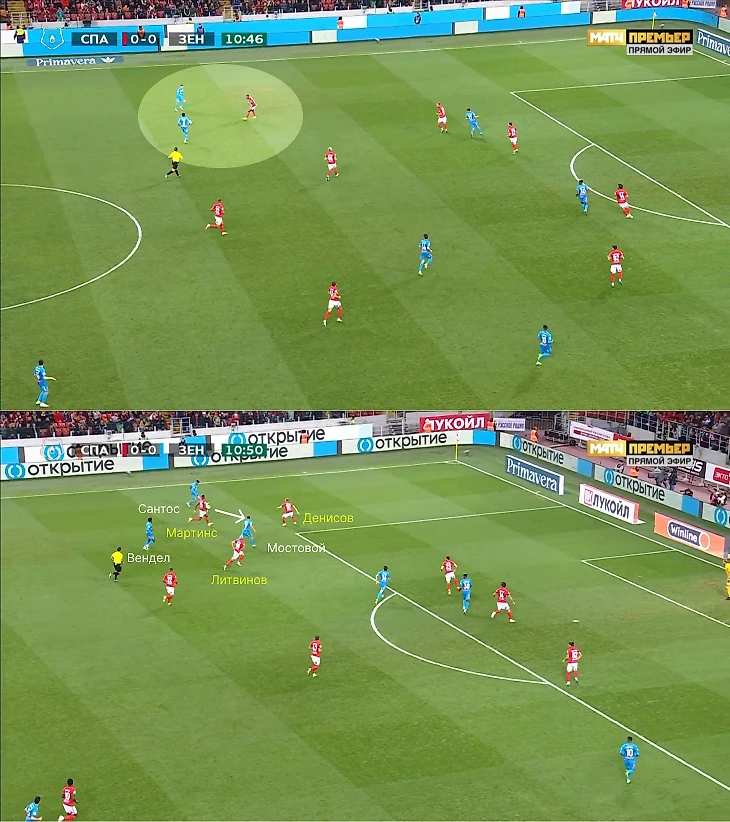 Важный момент – постепенное диагональное перемещение, когда «Зенит» атаковал слева, но постепенно переходил на правый фланг. В начале матча был топ-эпизод с выходом Сантоса и Вендела, когда они разобрались с Мартинсом и Литвиновым, а затем переместили атаку в середину. Часть ромба уже была отрезана, а защитник остался один против Малкома и Караваева.