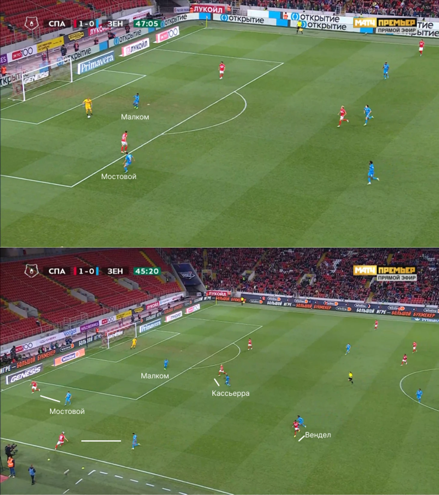 Ключевая деталь – в отработке разных механизмов: Руслана выжимал один из тройки полузащитников, Кассьерра перекрывал линию для передачи или забирал его персонально. Также «Зенит» включал разные опции для давления через вингеров – Малком и Мостовой играли по Джикии и Чернову, но в некоторых эпизодах располагались узко под Кассьеррой или откатывались на фланги.