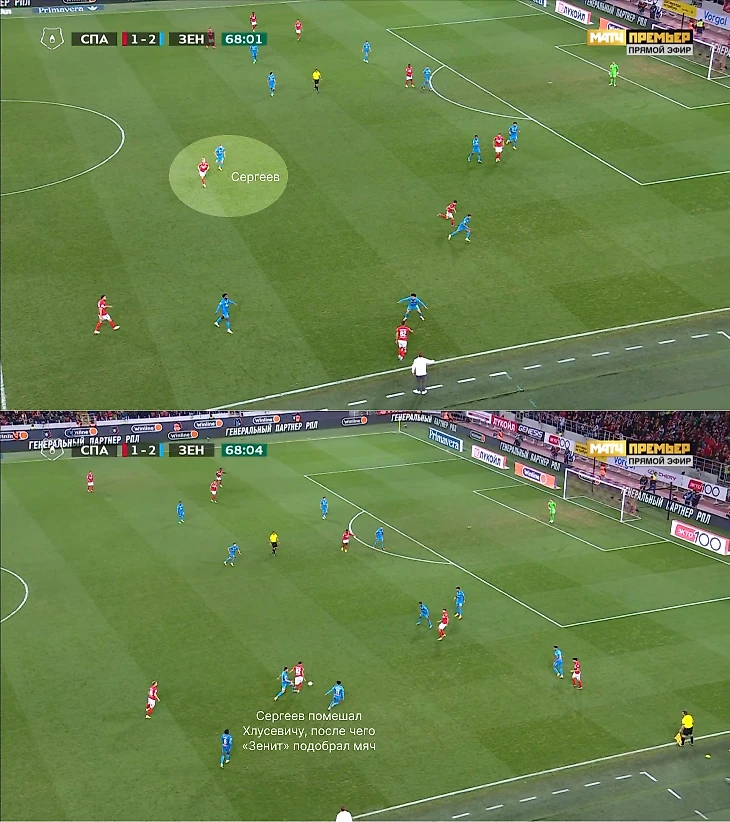 Оба раза качественно работали алгоритмы по защите флангов: Барриос, Караваев и Кузяев выключили продвижение от Зобнина и Хлусевича, а через несколько секунд видно, как Мостовой, Дуглас и Родригао опекали Денисова, Мартинса и Соболева.