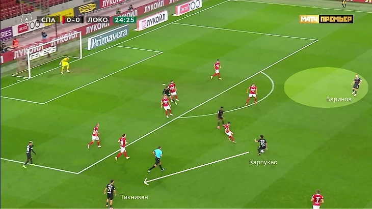 В этом эпизоде Карпукас выбрал вариант слева, хотя Баринов был свободен (в итоге Соболев вмешался в эпизод, но Промес на левый фланг так и не опустился).