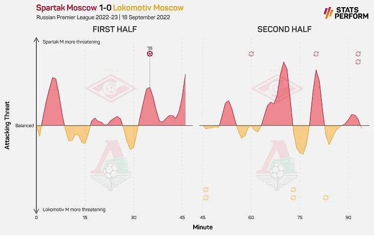 «Спартак» был гораздо опаснее в первом тайме: вел по ударам (12-2, 9-2 – из штрафной), создал несколько моментов (3 удара Николсона плюс гол Соболева), тогда как «Локо» вообще не пользовался спорной схемой хозяев в защите (об этом – ниже). Вторая половина матча получилась чуть ровнее, но «Локомотив» точно не создал больше (моменты Изидора и Игнатьева против ударов Зобнина и Умярова), а в концовке не смог забрать мяч, чтобы устроить хотя бы подобие штурма (0 касаний в штрафной после 85-й минуты).