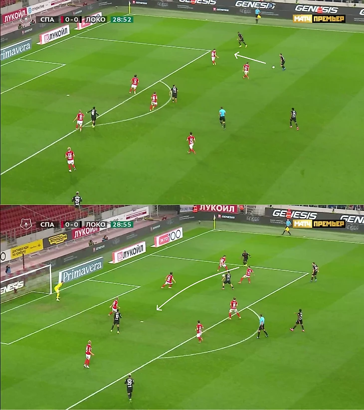 У «Локо» были возможности наказывать за недоработки вингеров (судя по всему, так разрешил Абаскаль). Периодически восьмерки «Спартака» успевали переключиться на фланги, но при мгновенных переводах появлялось пространство для подключений.