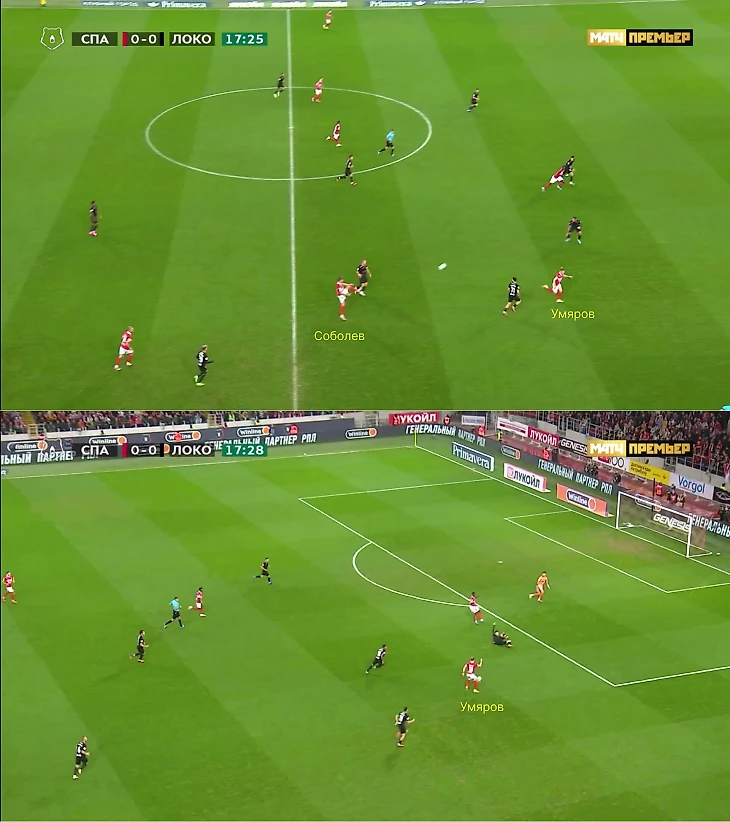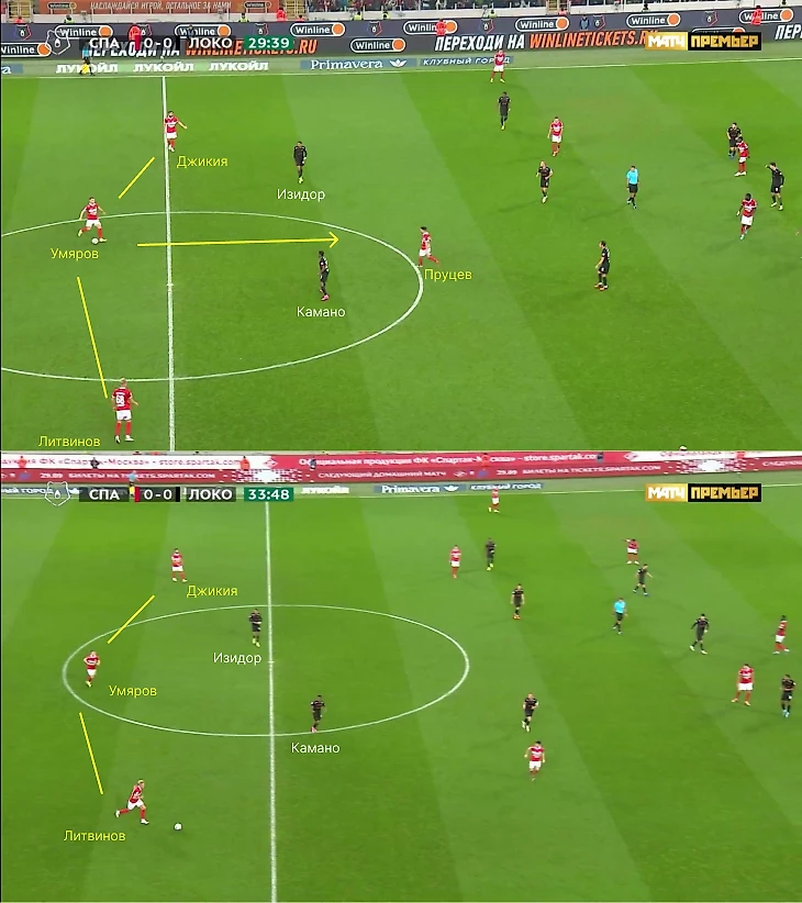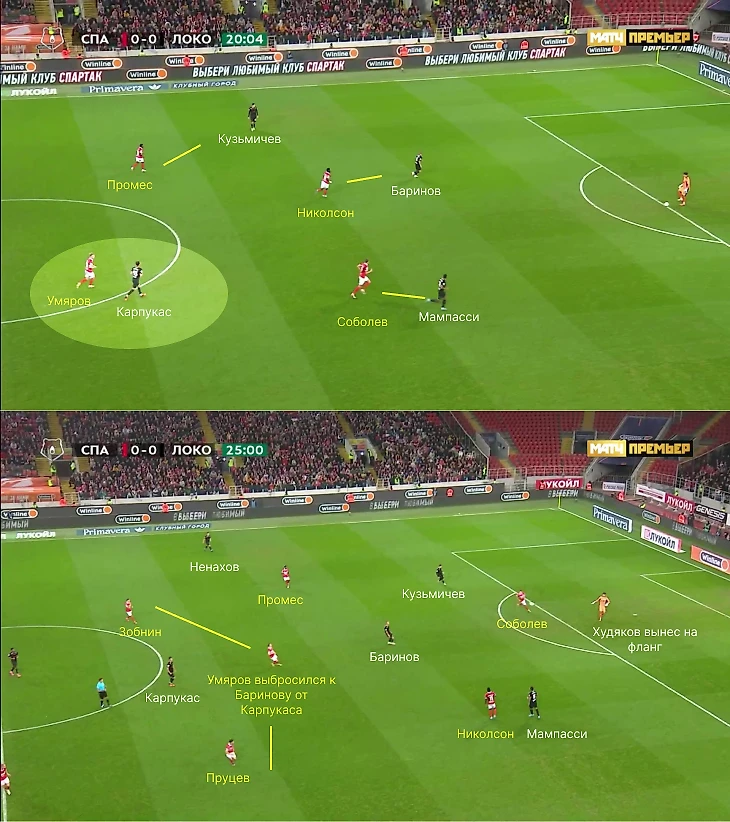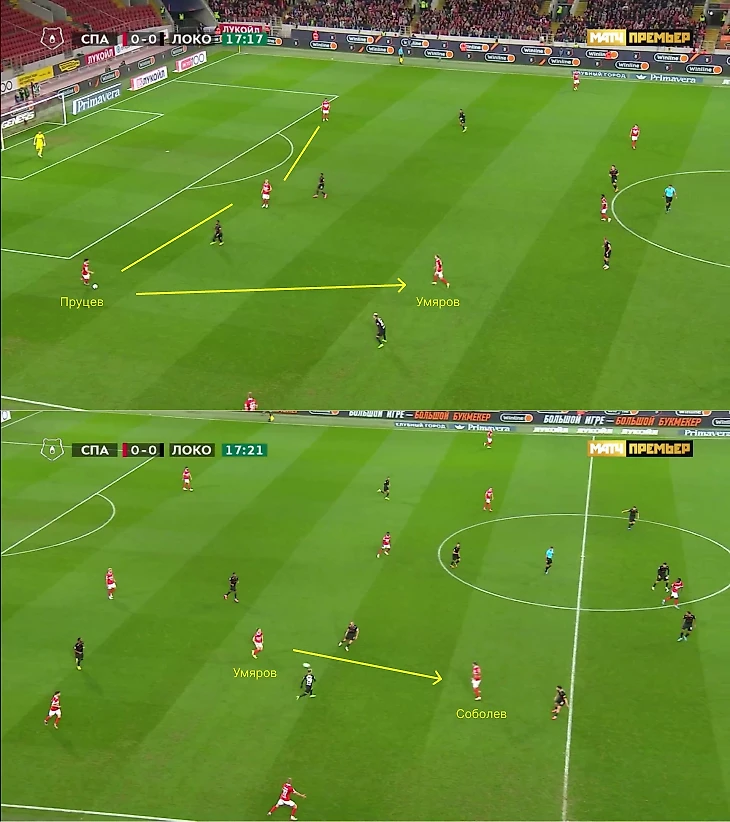 Часто движение Умярова заставляло Худякова отказываться от коротких розыгрышей. Плюс игра 1-в-1 стала важным фактором моментов «Спартака». В итоге «Локомотив» забрасывал на фланги, куда передвигались восьмерки, чтобы блокировать Ненахова и Тикнизяна.