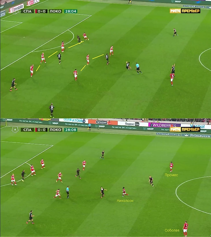 При длительной обороне «Спартак» опускал вингеров в глубину, но в первой фазе Соболев и Промес редко откатывались на свою половину. Периодически схема «Спартака» при обороне напоминала прошлогодний ПСЖ, когда Месси, Мбаппе и Неймар не оборонялись.
