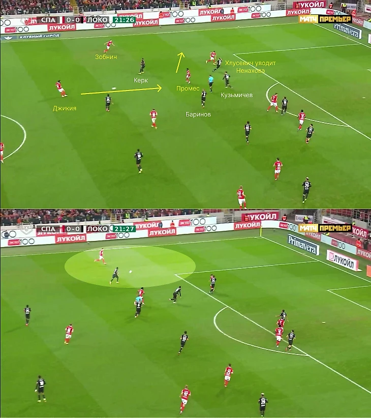 «Спартак» прессинговал в 4-3-3, где атакующая тройка поджимала центральных защитников плюс Баринова (если он опускался для розыгрыша) и Худякова. Учитывая плавающие позиции «Локо», перемещения полузащитников хозяев становились определяющими – Умяров, Зобнин и Пруцев располагались линией, где восьмерки занимали полуфланги (при передачах на фланг выдвигались на крайних защитников), а Наиль поднимался за Карпукасом.