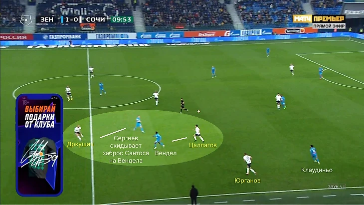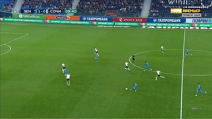 «Зенит» качественно прессинговал (накрывали тройку защитников и разыгрывающего опорника) и пользовался провалами «Сочи» в опорной зоне. Команда Семака контратаковала с отрывом, перегружала середину и добивала после позиционных атак. Первая быстрая атака – отбор Клаудиньо против Нобоа. «Зенит» неплохо выбегал, но защитник «Сочи» отобрал мяч у Вендела (Малком нашел Сергеева, он отбросил на Вендела), а затем его подобрал Кузяев. В итоге Клаудиньо забрасывал в штрафную, но до удара не дошло.