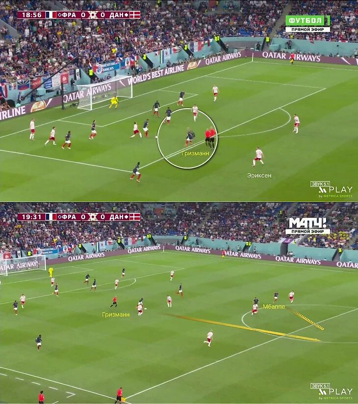 Фланги и Гризманн снова стали источником главной угрозы – и это получилось против более топовой сборной и структуры, которая не дает играть так широко, как это позволяла Австралия (Дания оборонялась пятеркой защитников).
