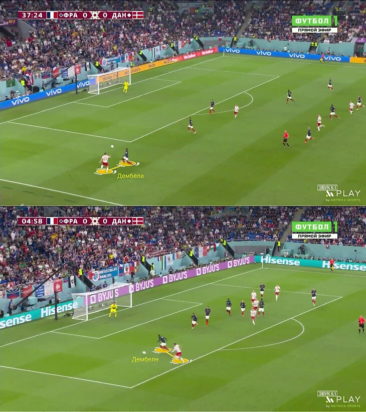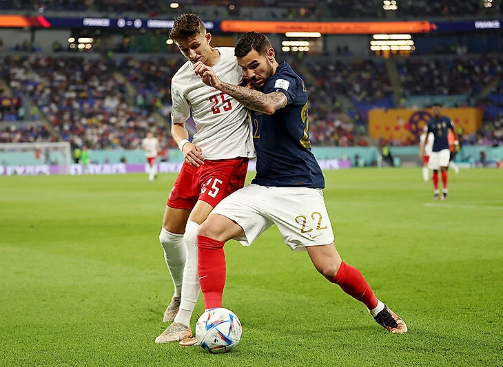 Возможно, Франция чуть успокоилась после первого гола и даже была шокирована пропущенным (небольшие флешбэки по плей-офф Евро-2021): легко впустили датчан в штрафную (Льорис спас), а затем Дольберг после аута проскочил мимо Упамекано, но команда Дешама классно вернулась.