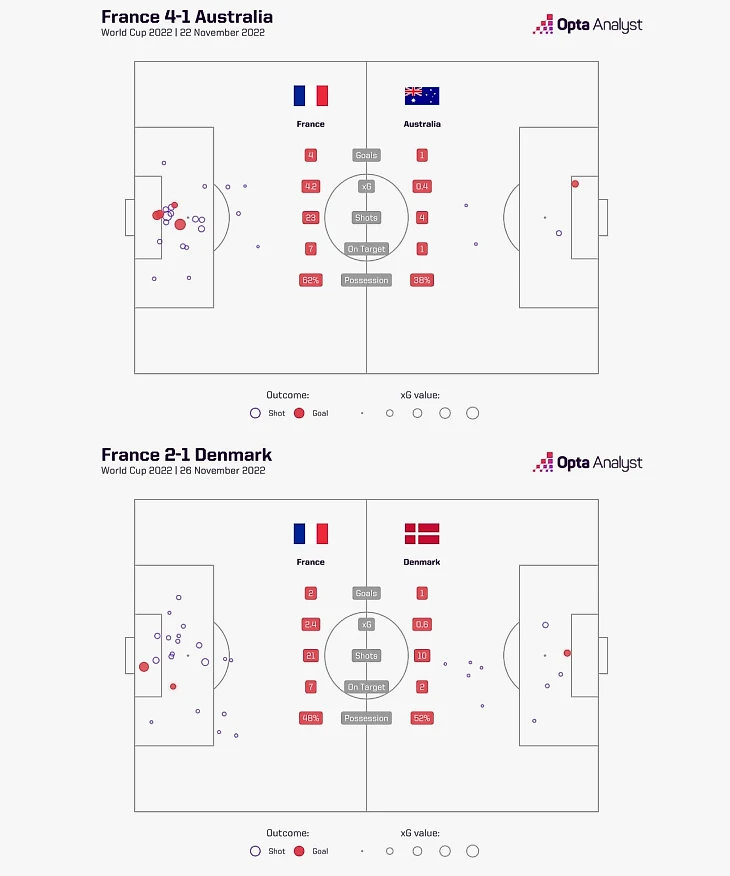 Два матча сборной Франции вошли в топ-5 ЧМ по созданной опасности: игра против Австралии – лучшая (4,2 xG), встреча с Данией – пятая (2,4 xG), между – Испания против Коста-Рики (3,48 xG), Германия в игре с Японией (3,27 xG с учетом пенальти) и Канада с бельгийцами (2,6 xG с учетом пенальти). Если рассматривать только xG без учета пенальти, оба матча Франции – в топ-3.