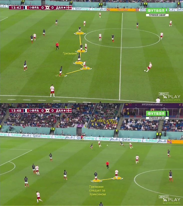 Великолепие Гризманна можно проследить и через оборонительную роль. Во многих эпизодах Франция оборонялась в 4-4-2, где Антуан мог оказаться в паре с Тчуамени, так как Рабьо слева отрабатывал за Мбаппе. Гризманну досталась непростая роль: он присматривал за Эриксеном (или за Хейбьергом, если он был рядом), выжимал его на чужую половину и периодически дорабатывал до штрафной.
