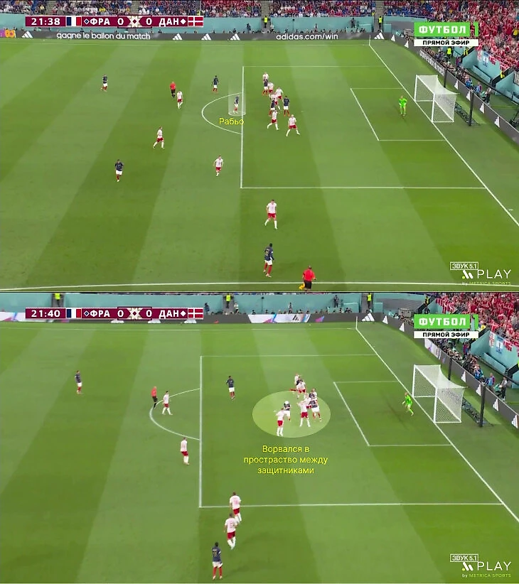 Вторая деталь – излишняя свобода Мбаппе, которая вынуждает рушить структуру как раз на фланге Тео (Эрнандес высоко поднимается для подстраховки), Рабьо и Тчуамени смещаются по цепочке, вынуждая непрофильного Гризманна отрабатывать в одной из самых ответственных зон. Похожий момент произошел после счета 1:1: полузащитники не успели закрыть коридор и в итоге допустили удар Линдстрема.