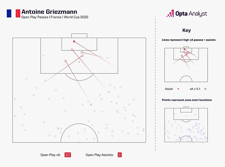 Гризманн – лидер чемпионата мира по ожидаемым передачам (2,2 xA, 1,7 – с игры) и хорош при розыгрышах и подачах стандартов.