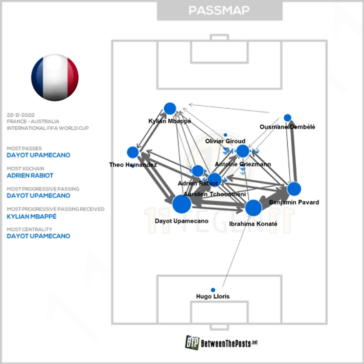 Из-за класса Австралии и травмы Люки Эрнандеса (на замену вышел более атакующей Тео) характер матча получился радикальным. Лидеры выдали несколько шикарных перфомансов: Мбаппе установил современный рекорд по действиям в штрафной (19), Жиру выбил 1,67 xG (многие сборные целиком набирали за игру гораздо меньше), у Гризманна набралось 9 передач с продвижением и 6 – под удар, а Тео Эрнандес создал 4 голевых момента. При этом Франция показала несколько деталей, которые могут сделать ее одной из главных команд чемпионата.