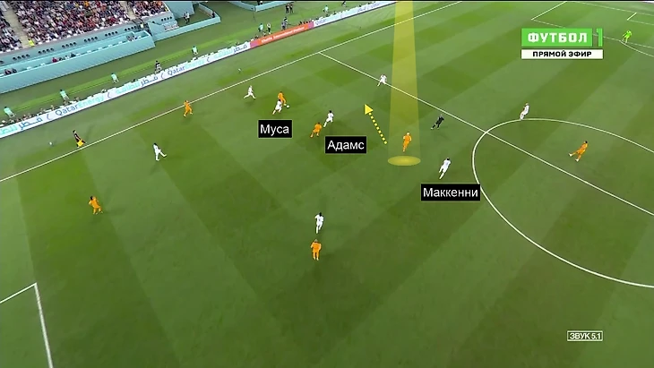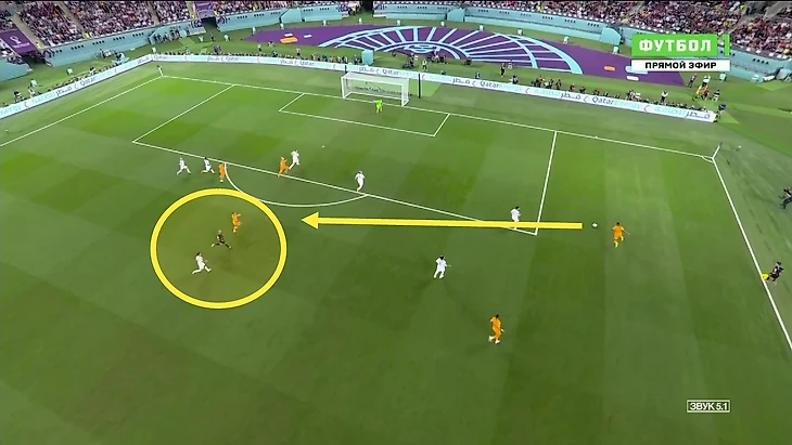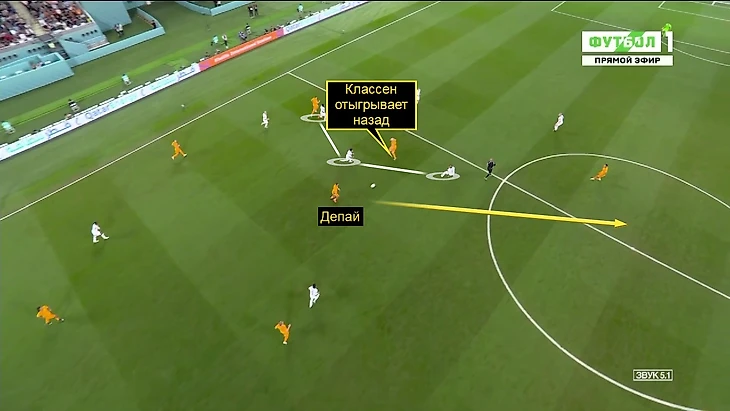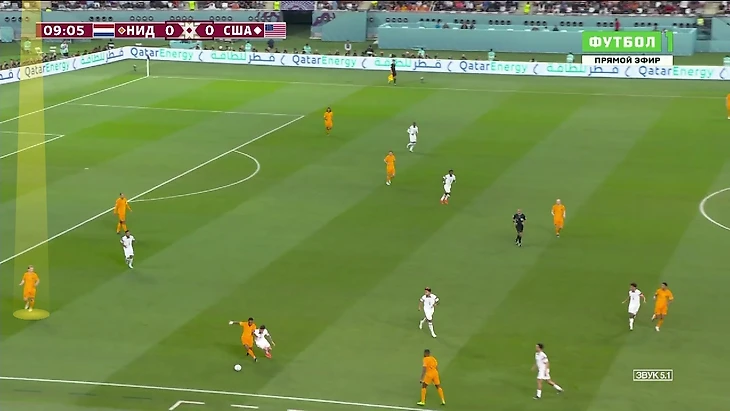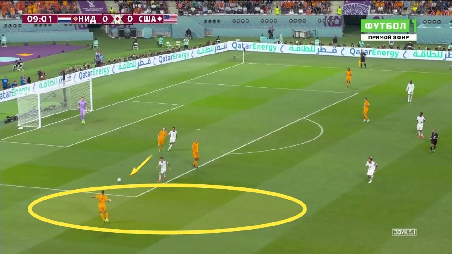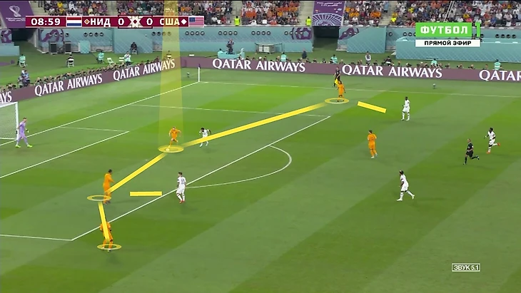 Очень важная роль у Френки де Йонга. Атаки Нидерландов в начале матча получались сумбурными из-за давления сборной США: тройка нападения зеркалила защитников, а латерали тоже находились под давлением.