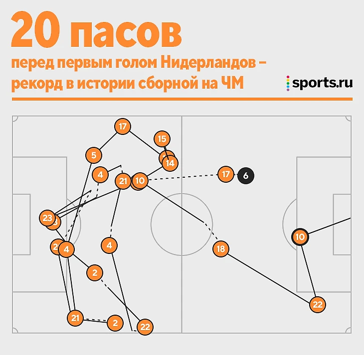 Первая атака Нидерландов превратилась в произведение искусства – команда Луи ван Гала расписала размашистую атаку из 20 передач. Это рекорд как минимум с 1966 года, когда начали считать подобную статистику.