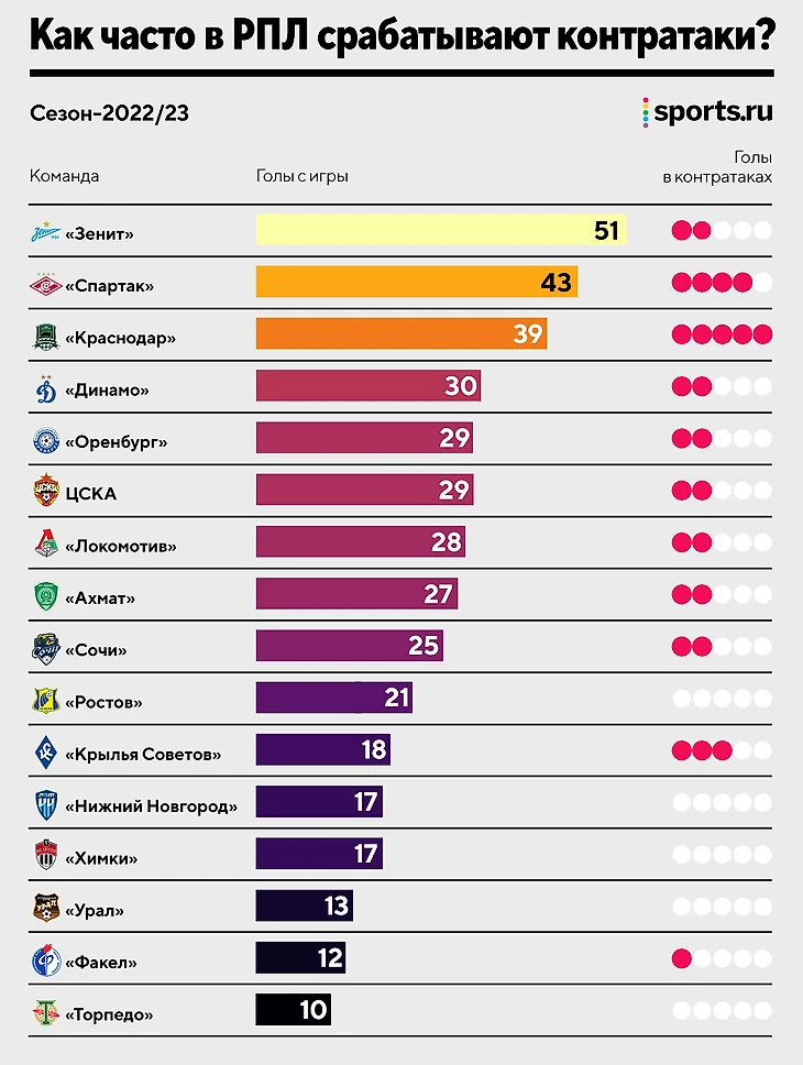 «Спартак», «Локомотив» и «Краснодар» – лидеры РПЛ по интенсивности прессинга. Однако при немецких тренерах давление «Локо» поражало своей бессмысленностью (эффективность на уровне осторожных «Факела» и «Торпедо»). В итоге «Зенит» с восьмого места по PPDA гораздо чаще доводил потери до ударов и в лидерах по реализации (6 голов). «Оренбург» и ЦСКА могли выжать чуть больше в контратаках, однако подвела реализация.