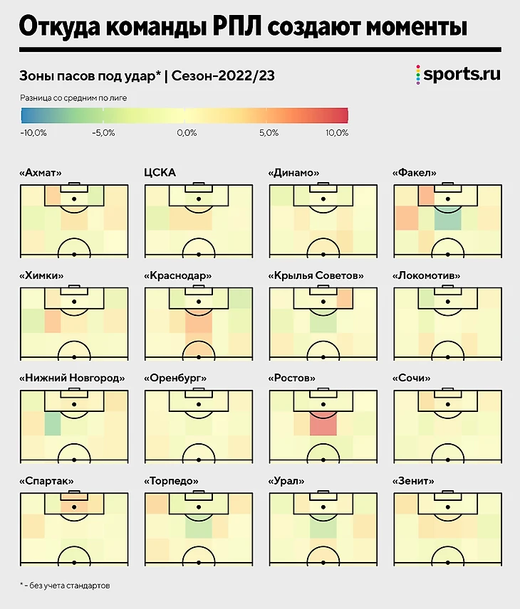 «Ростов» и «Краснодар» – главные по ключевым передачам из «зоны 14» (пространство на входе в штрафную около полукруга), тогда как «Факел» почти полностью ее игнорирует, а «Крылья», «Торпедо» и «Урал» используют реже среднего по лиге.