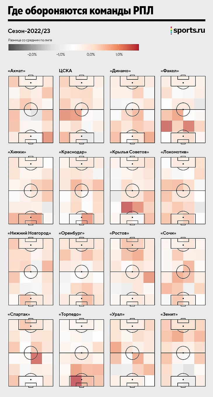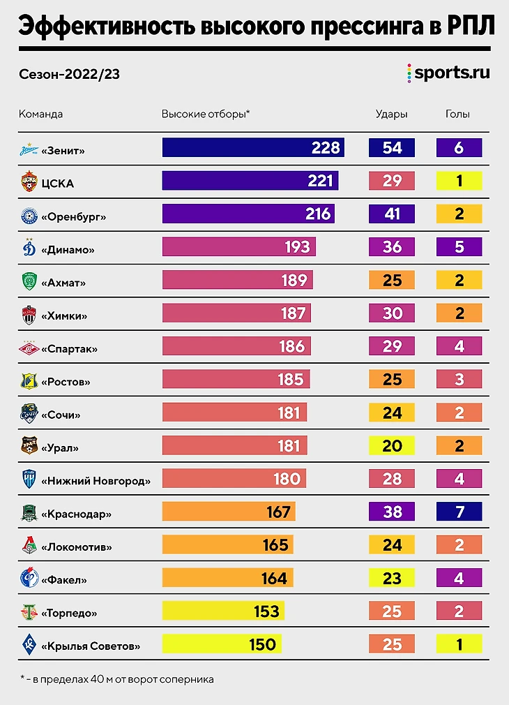 «Зенит», «Ростов» и «Оренбург» – среди лидеров по активному прессингу у чужой штрафной, тогда как ЦСКА, «Динамо», «Урал», фрагментами «Спартак», «Локомотив» и «Краснодар» более подвижны в средней трети, а «Факел», «Торпедо», «Химки» и «Крылья» очень часто запирают в штрафной. Отдельно впечатлили «Ахмат» и «Пари НН» минимальной вовлеченностью в середине и большим акцентом на фланги.