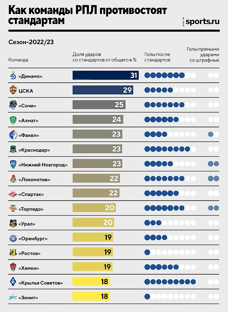 Удивили и «Крылья». В прошлом сезоне Игорь Осинькин жаловался на недостаток роста (сейчас все так же), но его команда лидирует по количеству ударов после штрафных и угловых, хотя идет только на 10-м месте по xG со стандартов.