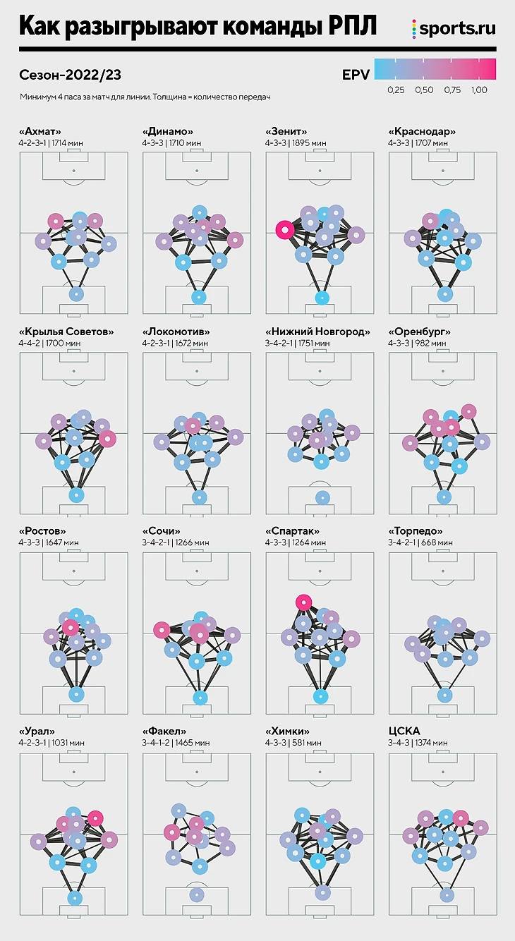 Как это работает: берем самую популярную схему команды в сезоне и отслеживаем связи не между конкретными игроками, а между позициями, на которых в каждом матче могут выходить разные люди.