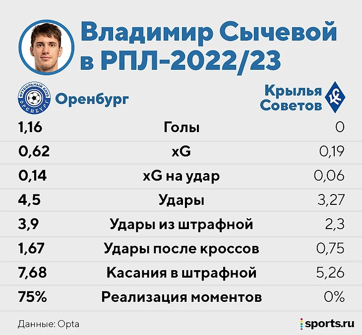 «Крылья Советов» первой половины сезона – проблемная и стилистически другая команда. Команда Игоря Осинькина шла 12-й по числу кроссов, недобрала почти 7 голов (xG), а зимой перестраивалась под новичков в атаке. Сейчас фланговых передач становится больше, но эффективность Писарского снизилась: в «Крыльях» у него всего 4 удара после навесов и прострелов (в «Оренбурге» – 18) и два явных запоротых момента (у Лички реализовал 10 из 13).