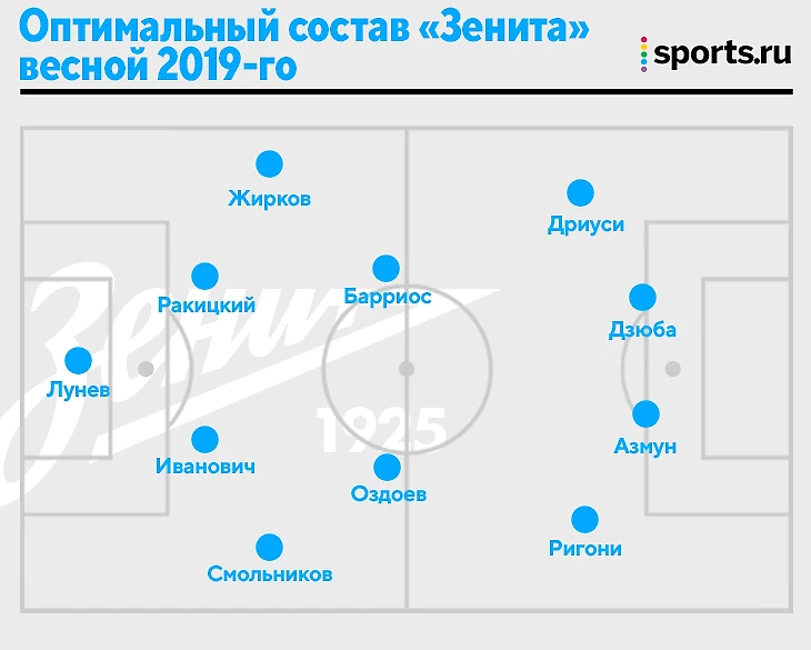 После сезона Семак признал, что зимой 2019-го «Зенит» стал гораздо сбалансированнее. Функции Паредеса распределили между Ракицким и Барриосом: Ярослав топово начинал атаки и положил три важнейших гола со штрафных, а Вильмар разгрузил партнеров идеальной подстраховкой (и повлиял на прогресс Оздоева). Появление Азмуна изменило на атаку: Дзюба раскрылся в новой роли подыгрывающего, Дриусси полноценно сместился налево (оттуда классно подавал и поддерживал прессинг). После травмы вернулся Жирков, после неудачной арендной поездки в Италию – Ригони. Слева Жирков пользовался заходами Дриусси в середину, а справа Ригони выиграл конкуренцию у Мака и помогал в контратаках.