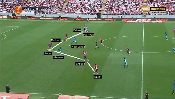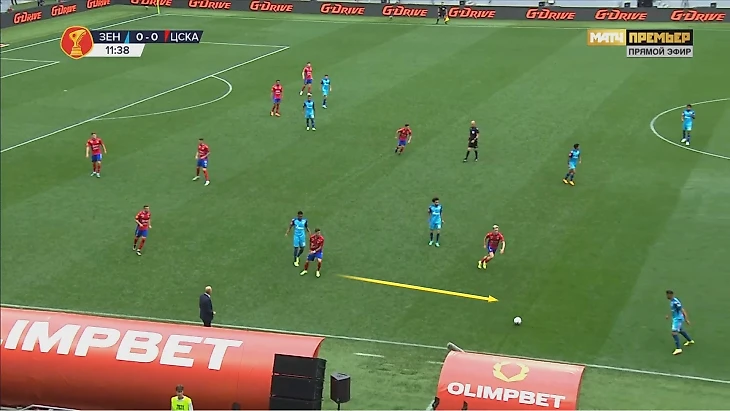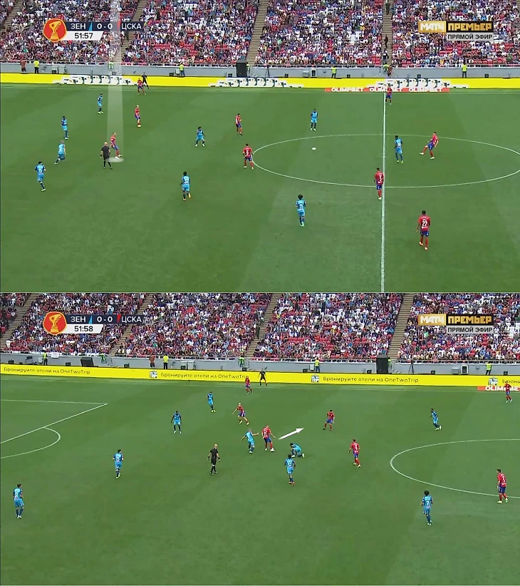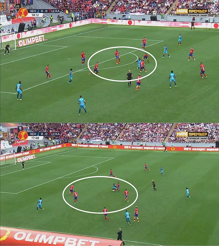 ЦСКА позволял «Зениту» контролировать мяч на его трети, но был готов к заходам через середину. Отсутствие Вендела снизило эффективность продвижения, а Семак предпочел, чтобы Клаудиньо играл на фланге и периодически заходил в середину, но уже на чужой, а не своей трети. Компенсирующая идея – игра в двух нападающих. Малком удваивал середину вместе с Кассьеррой. Это могло приводить к нескольким сценариям.