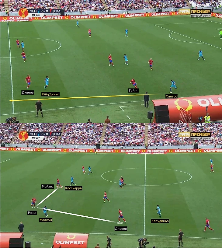 Второй – передачи Сантоса под забегания Кассьерры и Малкома. «Зенит» пользовался тем, что Гайич встречал Дугласа, Дивеев часто выбрасывался за Клаудиньо, поэтому Малком и Кассьерра оставались 2-в-2 с Рошей и Мойзесом. Плюс далеко не всегда Милан накрывал Сантоса в момент приема, поэтому бразилец двигал мяч. Например, в этом эпизоде видно, как рывок Дивеева за Клаудиньо и наличие Кассьерры около Мойзеса оставили Малкома 1-в-1, но Роша своевременно вступил в борьбу.