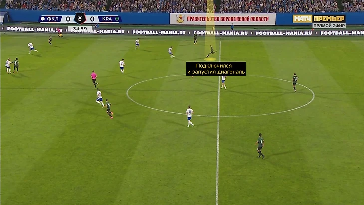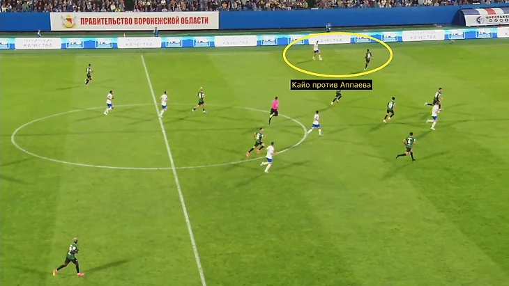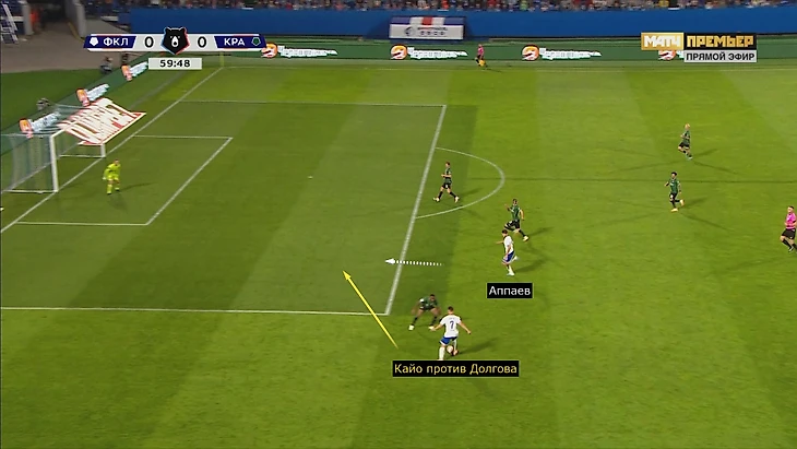 Во втором тайме «Факел» так наиграл на реальный момент: Долгов остался 1-в-1 с Кайо, а затем классно подключился Аппаев. Вводные – те же. «Краснодар» потерял мяч на чужой половине, Алонсо и остальные застряли высоко, зона Кайо разорвана.