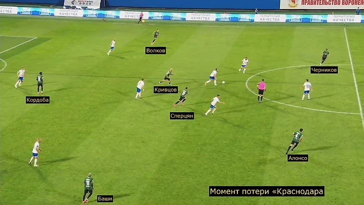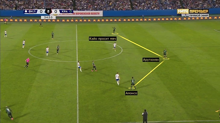 При владении Алонсо оставался в тройке с Арутюняном и Кайо. Это позволяло Кайо атаковать через полуфланг, а Баши и Волков поднимались выше. Здесь тоже ничего нового – так «Краснодар» владел мячом и с Петровым в качестве левого защитника.