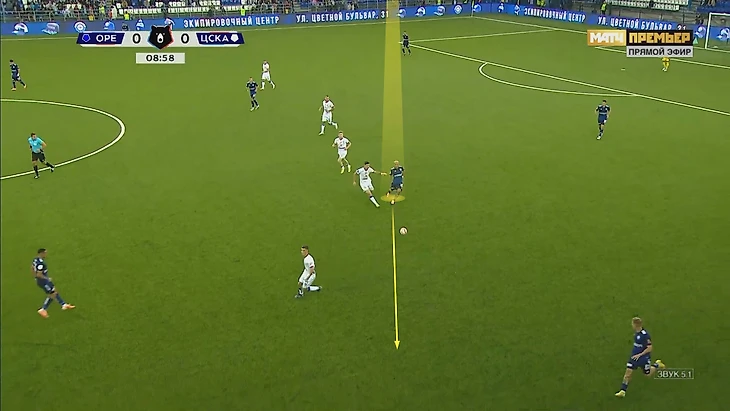 И другой возможный эффект от давления «Оренбурга» – в начале второго тайма ЦСКА несколько раз отказывался от выхода через передачу Торопа защитникам, сразу выбивая вперед.