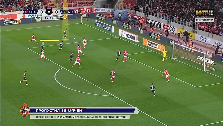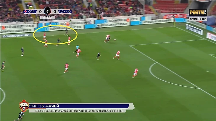 Во втором тайме ЦСКА так же бомбил края: латерали несколько раз простреливали, структура «Спартака» не адаптировалась, поэтому второй гол напрашивался. Конечно, перед тем, как ЦСКА снова вышел вперед, Мартинс облажался с приемом, но затем «Спартак» рассыпался по классике: Пруцев высоко застрял, Денисов ушел к Файзуллаеву, из-за чего Гайич стоял в одиночестве (при этом Медина во время ничейного мяча сделал шаг вперед, увеличив расстояние от Милана).