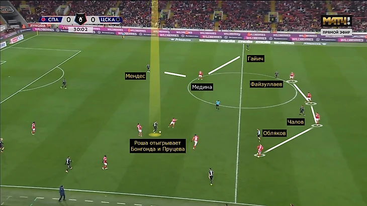 В первой голевой атаке ЦСКА классно перешел с правого фланга на левый. Все началось с подъема Роши в опорную зону: Виллиан удержал мяч под давлением Бонгонда и проткнул его мимо Пруцева. Здесь важны позиции атакующей тройки, которая сузила оборонительную четверку «Спартака» и освободила края. Кажется, Медина ориентировался на Мендеса – это усугубило свободу Гайича. В послематчевом интервью Милан рассказал, что ждал свободу в этих зонах, когда узнал состав «Спартака».