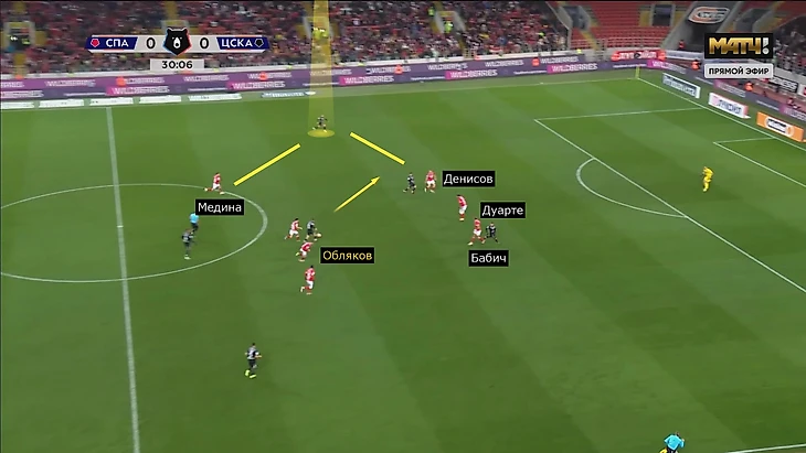 Но адаптации «Спартака» к ЦСКА не было. Медина оборонялся справа, куда подключался Гайич. Периодически он добегал назад, но зачастую застревал впереди. ЦСКА неоднократно выходил на кроссы разного типа: где-то вингеры «Спартака» банально не блокировали подачи, где-то не успевали назад либо оборонялись без помощи опорников.