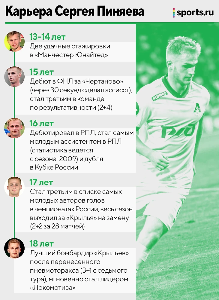 Сергей Пиняев громко ворвался во взрослый футбол: в 17 лет сыграл в 28 матчах РПЛ, стал основным после ухода Антона Зиньковского и перенесенного пневмоторакса, а весной сиял в «Локомотиве» Михаила Галактионова.