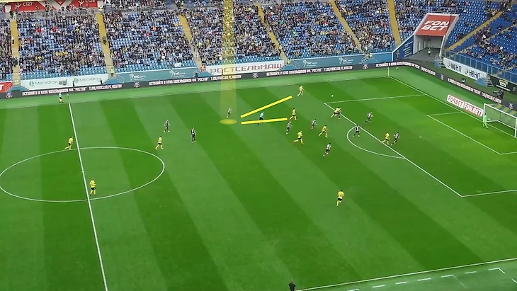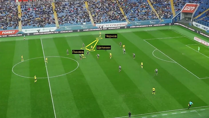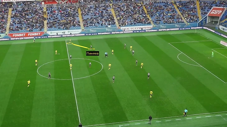 Проблемы есть и у Пиняева. Последний пример – первый тайм с «Ростовом», где Галактионов снял вингера уже в перерыве. Если в хаотичном давлении Пиняев более-менее дисциплинированно вставал около Чернова, то на своей половине был бардак: регулярно стартовал с опозданием, мягкотело встречал у штрафной, из-за чего Ненахов часто оставался 1-в-2.