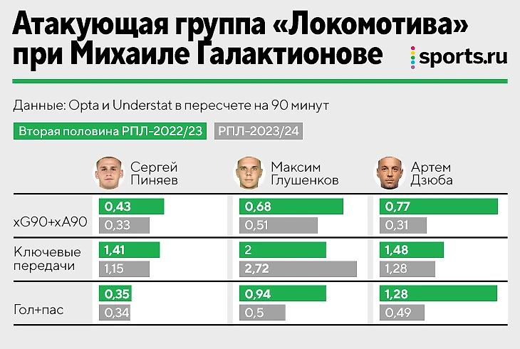 Пиняеву удобнее атаковать по ширине. В «Крыльях» левый защитник Горшков оставлял край Сергею, а сам заходил в полуфланг. Галактионов адаптировал идею для «Локомотива». Весной Наир Тикнизян атаковал в полуфланге и середине для изоляций Пиняева. Тогда алгоритм прекрасно работал: топ-матчи с «Ахматом» (1:0) и «Краснодаром» (3:2), до травмы шел одним из лидеров по ключевым передачам после дриблинга и вовлеченности в удары. Плюс Галактионов подстроился под оборонительные стандарты: Пиняев и Глушенков во время угловых стартовали с центра поля, чтобы выбегать в контратаки.